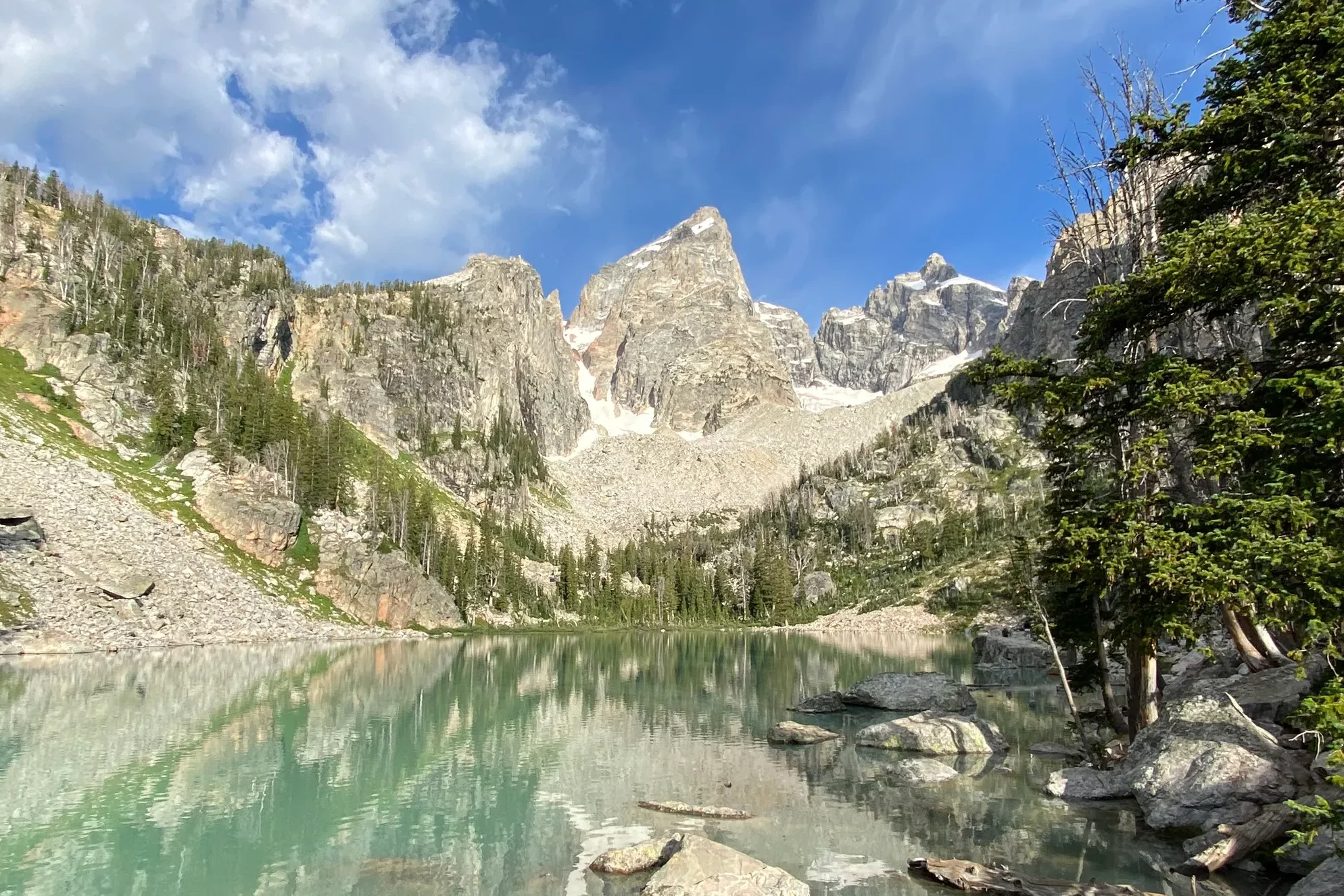 Roughly 8 miles roundtrip with 2,300 feet of gain — and the final push isn’t even on a maintained trail. You climb hard, pick your way through boulder fields, and top out at an electric-blue alpine lake sitting directly beneath the Grand Teton’s east face.